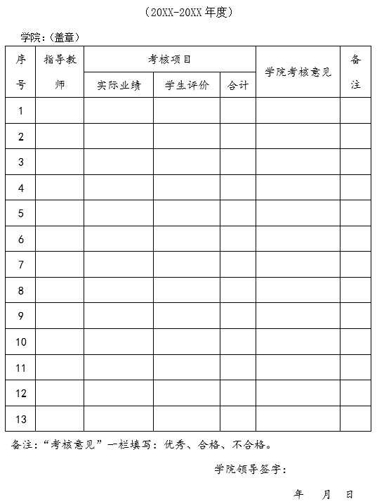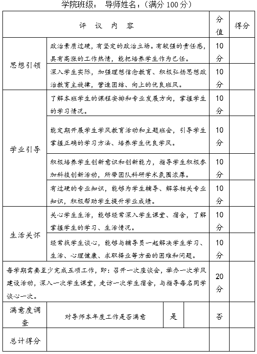 (1)实际业绩部分(30%):导师填写《经济与管理本科生导师学年度考核业绩表》(附件1),学院按导师工作的基本职责,从导师指导活动的数量和效果、工作记录等方面进行考核评分。