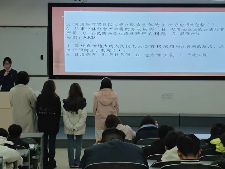 本网讯 邓婷 报道:为进一步推动校园宪法宣传教育常态化、长效化,增强普法活动吸引力与感染力,切实提升同学们的法治素养,引导大家成为宪法法律的忠实崇尚者、严格遵守者、坚定捍卫者,经济与管理学院紧扣2025年国家宪法日“学习宣传贯彻习近平法治思想,推动宪法深入人心”主题,于12月5日晚在第三教学楼阶8教室,开展了以“弘扬宪法精神,共筑法治社会”为主题的宪法知识竞赛活动。