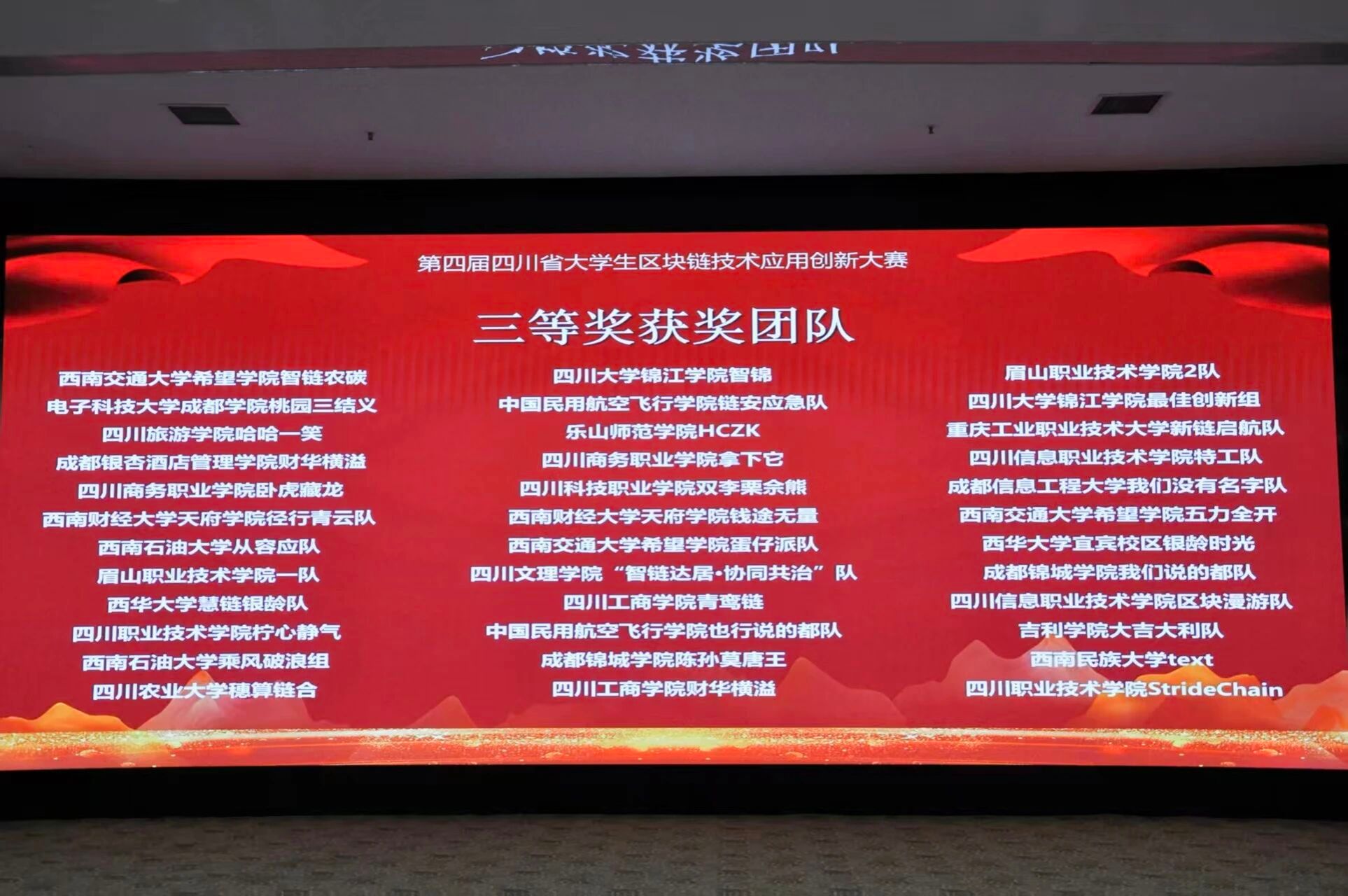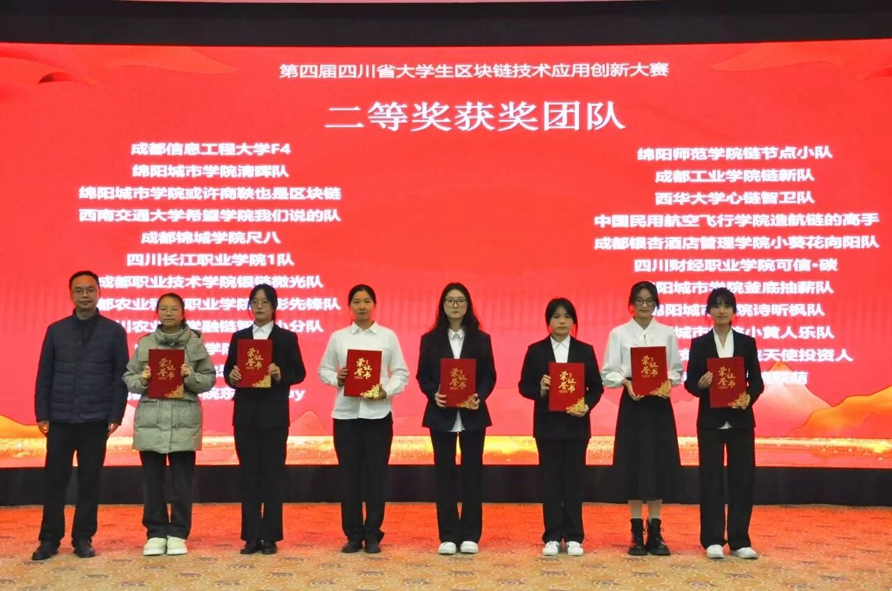 2025年11月22日,第四届四川省大学生区块链技术应用创新大赛暨川渝大学生区块链技术应用创新大赛决赛在成都信息工程大学落幕。经过激烈角逐,我校经济管理学院派出的参赛团队最终荣获省级二等奖1项、省级三等奖2项。