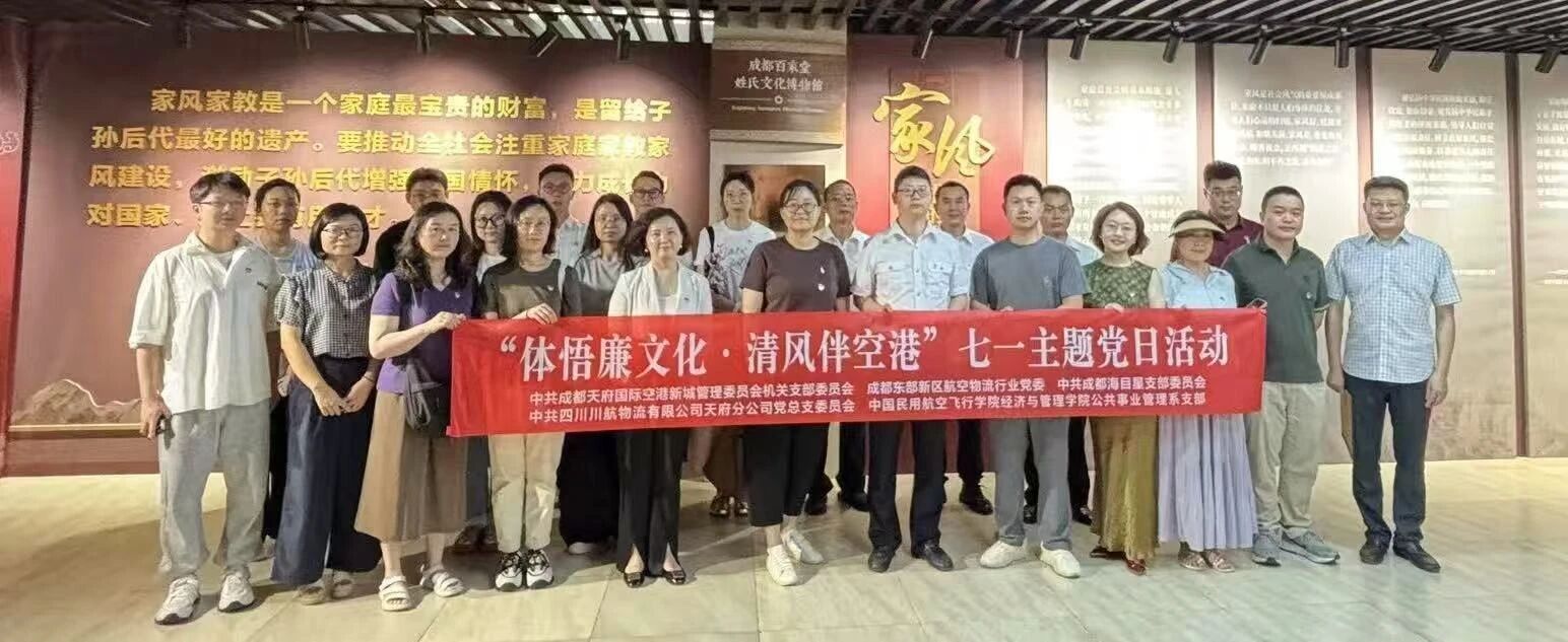 为深入学习贯彻习近平新时代中国特色社会主义思想,推动党史学习教育常态化、长效化,增强党员文化认同和民族自豪感,坚守共产主义远大理想和中国特色社会主义共同理想。2025年7月1日(建党节),经管学院公共支部与空港新城机关支部联合开展主题党日活动,组织党员参观廉洁文化基地—成都百家堂姓氏文化博物馆。