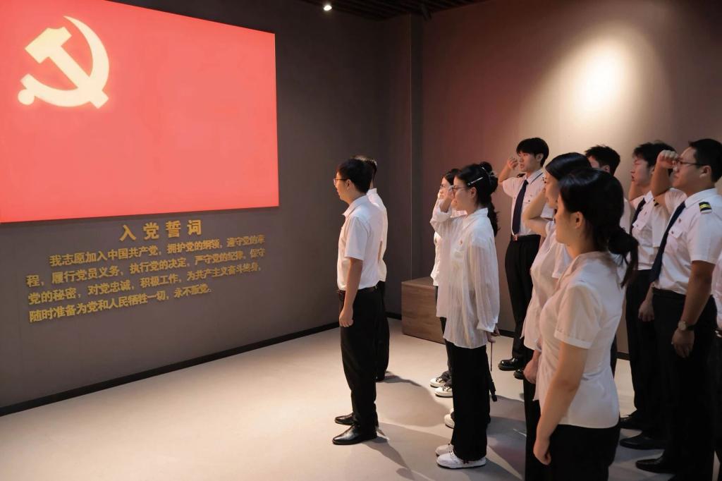 随后,面对鲜艳的党旗,全体党员庄严举起右拳,重温入党誓词。铿锵的誓言在馆内回荡,字字千钧,饱含着对党的无限忠诚;句句滚烫,凝聚着为党的事业奋斗终身的坚定决心。