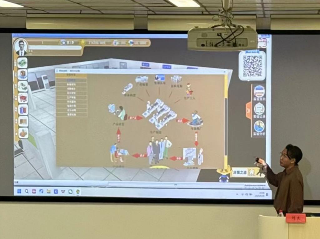 在正式讲座环节,刘文老师以多年企业管理教学与竞赛指导经验为基础,围绕模拟经营系统的结构与应用展开系统讲解。从平台界面与模块功能入手,详细演示操作流程,带领同学们逐步熟悉企业经营的全流程逻辑。课程内容涵盖设计研发、生产制造、市场营销、组间交易与终端消费等关键环节,层次分明、条理清晰。
