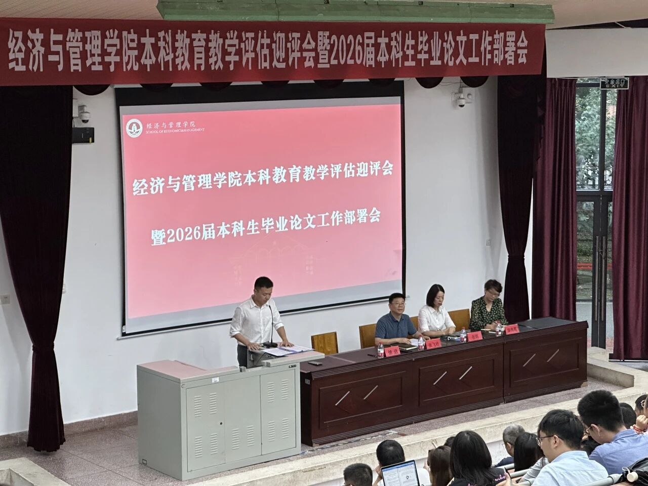 为深入贯彻落实学校关于本科教育教学审核评估工作的决策部署,进一步在全院范围内营造好本科教育教学审核评估工作氛围,积极动员全院师生投身本科教育教学评估迎评工作,躬身笃行彰显责任担当,同时,提前谋划、认真组织、切实做好学院2026届本科毕业生毕业论文(设计)工作,以高水平论文成果支撑学院高质量本科教育教学建设与发展。10月9日,经济与管理学院在一教阶5教室召开本科教育教学评估迎评会暨2026届本科生毕业论文工作部署会。学院党委班子成员、各系室主任、教师代表及2026届全体本科毕业生参加会议。会议由学院党委副书记、纪委书记徐远主持。
