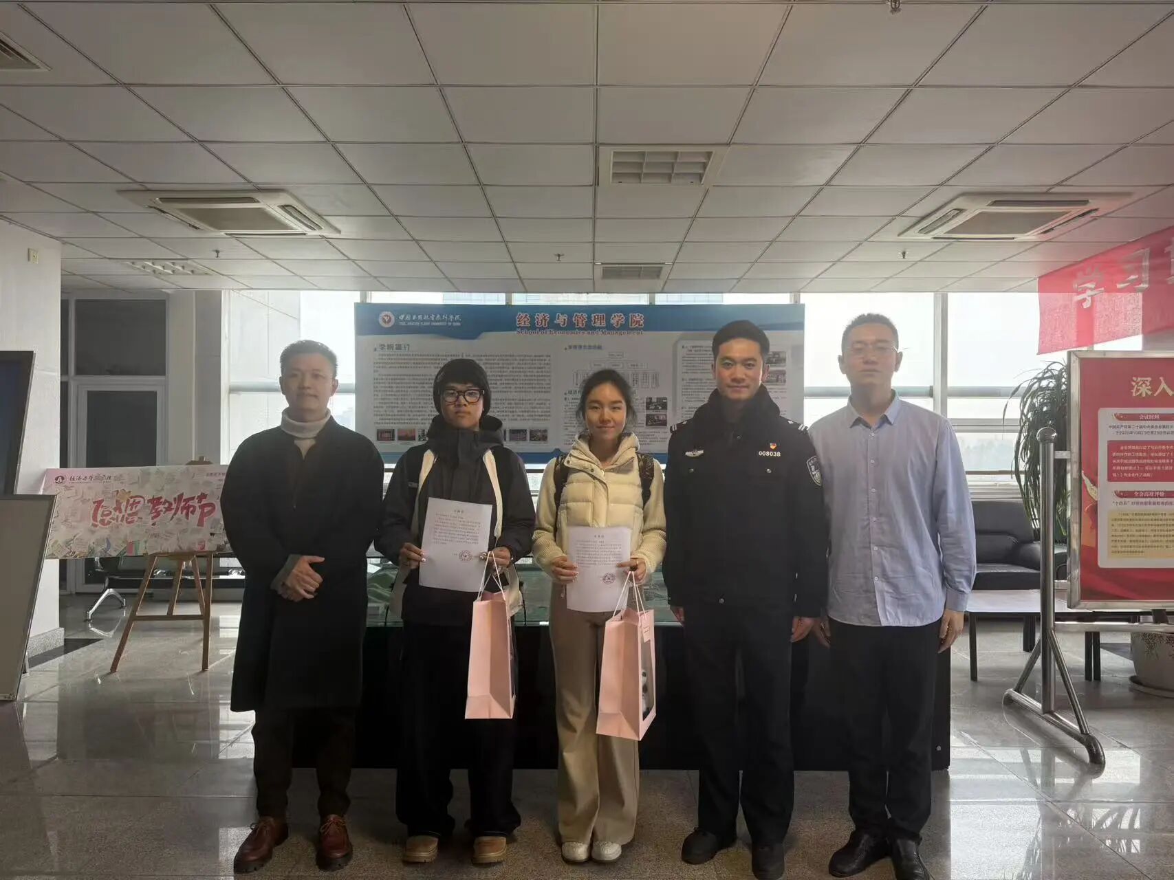 12月18日,经济与管理学院接到校公安局(平建办)关于伍睿涵、高瑞涵两名同学拾金不昧事迹的表扬信。同时,校公安局(平建办)委托“一院一警”联系民警王昶亲自对两名同学表示感谢和慰问,鼓励同学们坚持高尚品行,引领校园新风,共筑青春校园、美丽校园、平安校园。